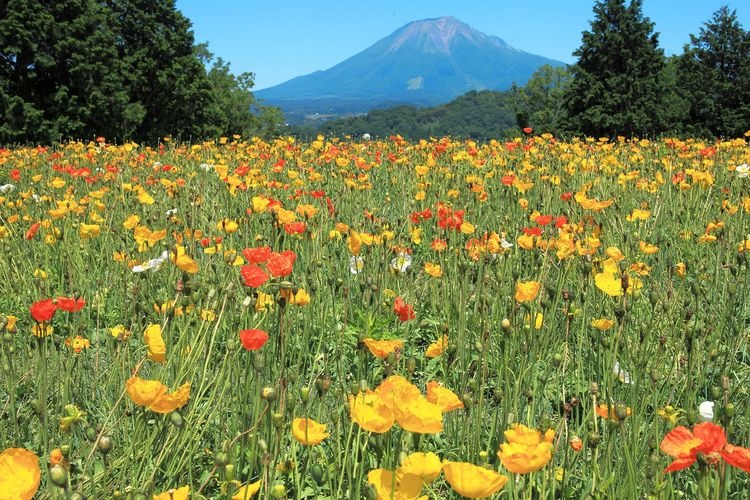 A stunning collaboration of majestic natural scenery with Mt. Daisen as a backdrop and beautiful flowers.