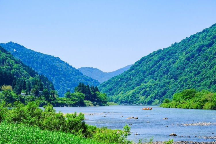 搭乘遊船順著最上川而下,盡情享受雄偉的山巒和四季變換的景色!